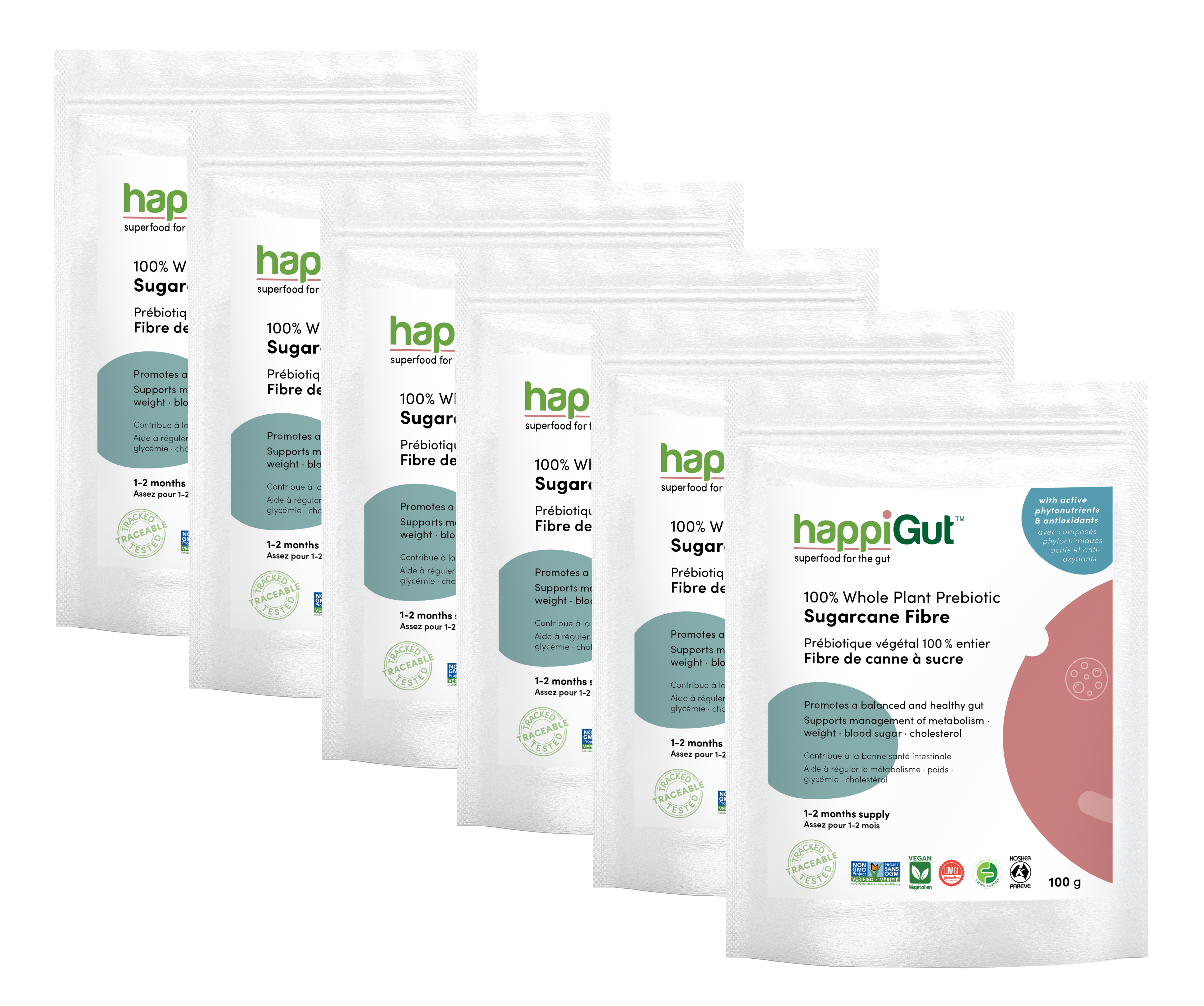 A 6 pack bundle of happiGut™ whole plant prebiotic fibre for family and friends to support and maintain good gut health